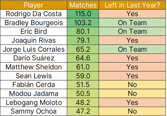 Meanwhile, injuries undermined Gavin’s preferred tactical structure in 2023, particularly in the back line. Bradley Bourgeois, the team’s captain, missed almost half the season, and other influential players like Rashid Tetteh and Moses Dyer were absent for crucial weeks-long runs during 2023.