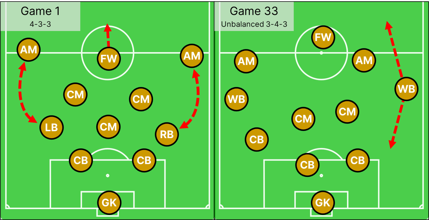 Amidst the upheaval, Gavin began the year in a classic 4-3-3 or 4-2-3-1, emphasizing interchange on the flanks and using Da Costa as a false nine. The system wasn’t leading to rampant form, per se, but it still generated strong performances underlined by a fun-to-watch pressing style.