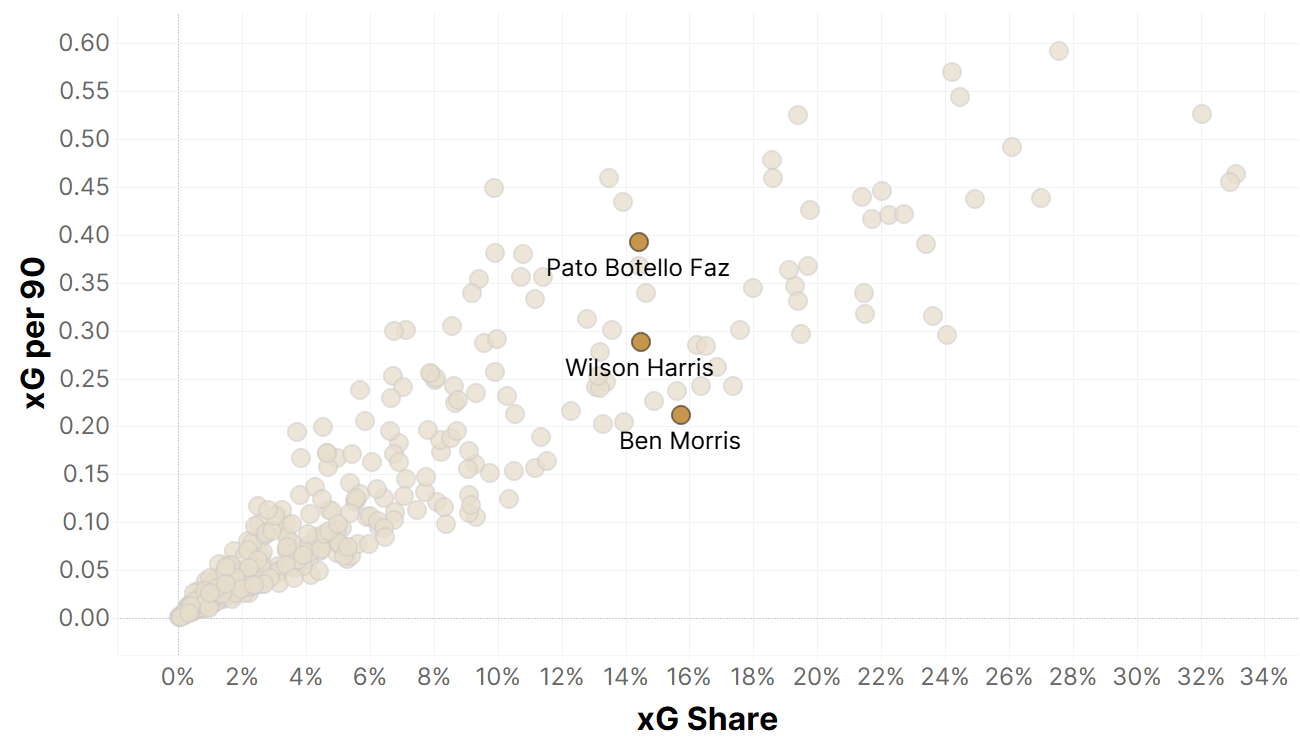 The thing that stood out in Faz’s eight-goal campaign was the completeness of his game. He ranked above the 80th percentile in terms of touches per match and ranked near or within the top quarter of strikers in terms of aerial wins and fouls drawn. Faz wasn’t a creator, but he wasn’t asked to be one.