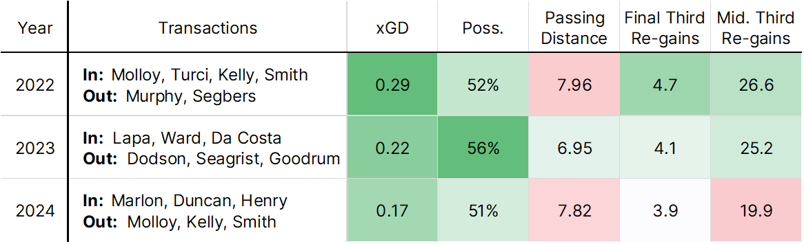 Memphis shifted anew heading into 2024, becoming more direct, less possessive, and markedly more neutral in the press. Again, the additions fit the bill. Marlon entered at the striker spot to add speed on the end of long balls. Zach Duncan and a permanently-signed Emerson Hyndman added central ball-winning. When Glass tried to shift mid-year, more possessive pieces like Jon Bakero and Triston Henry were added to try and let it happen.