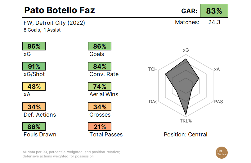 Faz’s first Championship season was strong. While Detroit’s offense was historically bad by the standards of a playoff team, the blame doesn’t belong to their leading striker. Indeed, the then-26-year-old was responsible for 18% of his club’s overall goals scored, comparable to…well…Ben Morris on the 2024 iteration of Detroit.