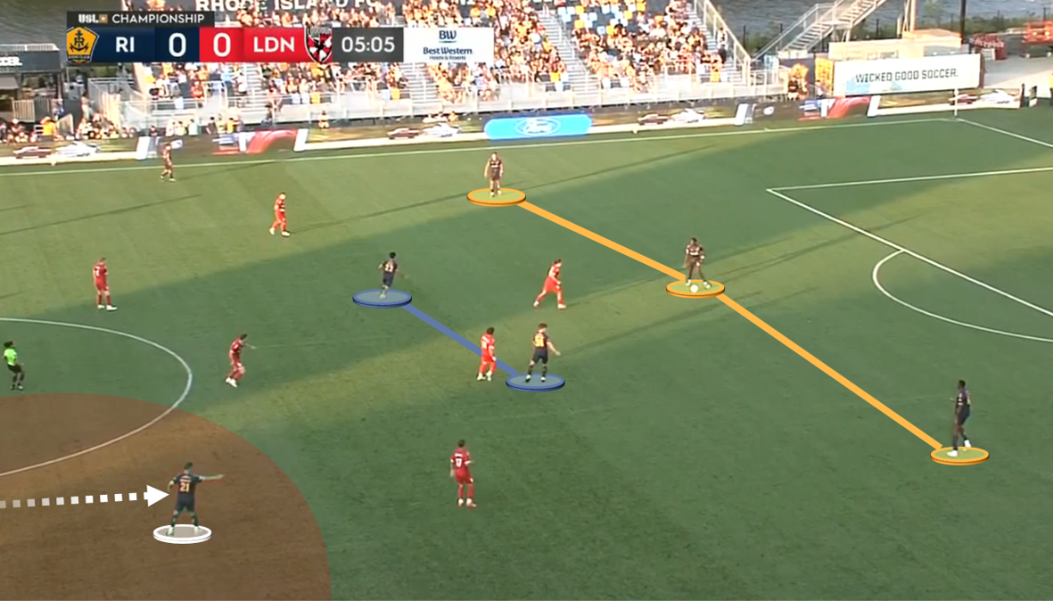 Ideally, Rhode Island’s 3-4-3 build shape will goad the opposing midfield forward, opening space to advance between the lines. That can happen in a few ways. Marc Ybarra might receive in the pivot, turn, and dribble past an opponent. Ybarra or Corcoran could receive – perhaps from an advanced Vegas in a pseudo-back four –draw pressure, and then lay the ball off to a wide teammate. RIFC could skip the pivot entirely, using their center mids as stalking horses for a center back-to-forward ball.