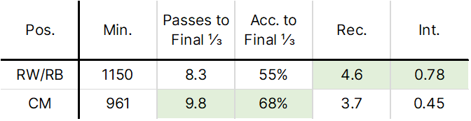 Naturally, those crossing numbers have gone down as Evans’ role has changed. Splitting time between the No. 8 spot in a 4-1-4-1 and a No. 6 deployment in a double pivot, Evans has actually seen his recoveries and interceptions go down while vastly improving upon his progressive passing.