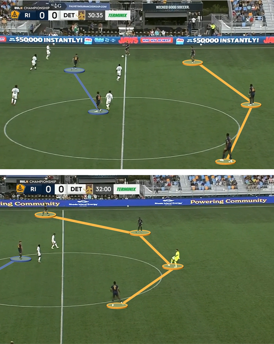 In the meantime, note how Detroit aligns their defensive unit. Two center backs stay tight, Shane Wiedt (their right-sided center back) elbows up. Often, Le Rouge dropped a center mid deep to approximate a back four, and Kobe Hernandez-Foster (denoted in gold) does the job here…