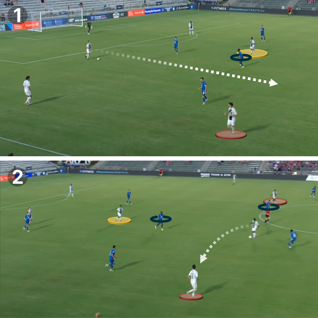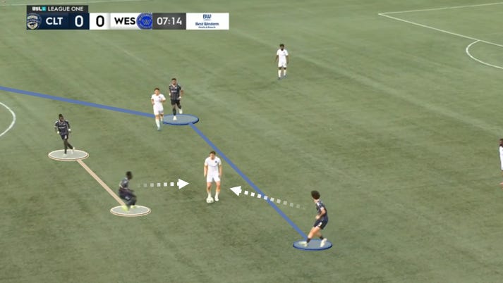 Take the example above. Opposing Charlotte presses with one striker and two No. 10ish wingers, and Evans lurks behind that highest presser while waiting for his moment to arise. Once the striker commits upfield, Evans steps ahead to open himself for a bounce pass by way of his pivot partner, Chapa Herrera.