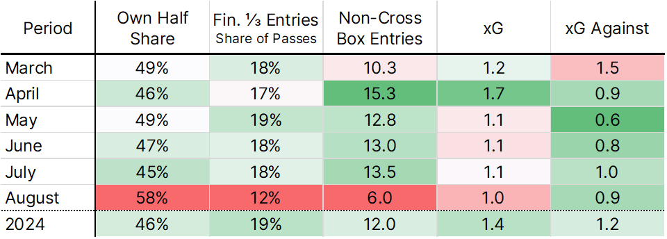 Rodriguez attempted just four passes into the final third and two total long balls, running contrary to the profile that made him so special in seasons past. Again, the structure was good, but the lack of individual expression tended to hurt.