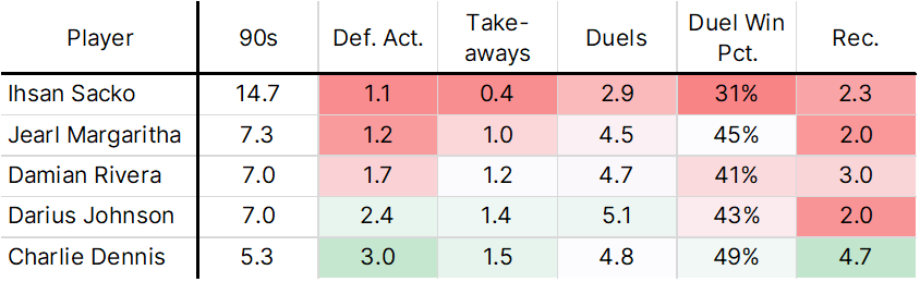 The high-level numbers can be a bit misleading, but they paint the picture of a passive wing corps. Yes, Darius Johnson and Ihsan Sacko have played a good share of their minutes at the No. 9 spot. Yes, Dennis gets a slight boost from his time spent as a No. 8. Level it all out, and you’ve still got a set of wide options that lose the vast majority of their duels, rarely recover the ball, and – according to the eye test – often fail to track back.