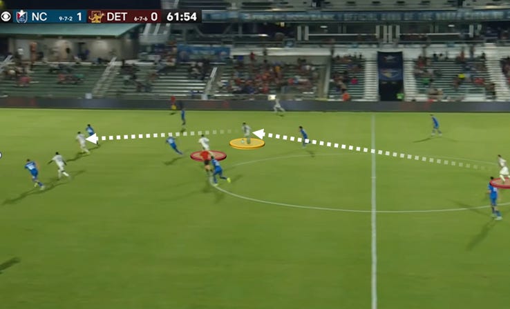 The sequence below is exactly what Danny Dichio hoped Detroit would look like on Friday night, facilitated by a right-tilted back line and clever midfield spacing. As we’ll see, North Carolina’s chameleonic defense often stopped that blueprint, but that’s for later.