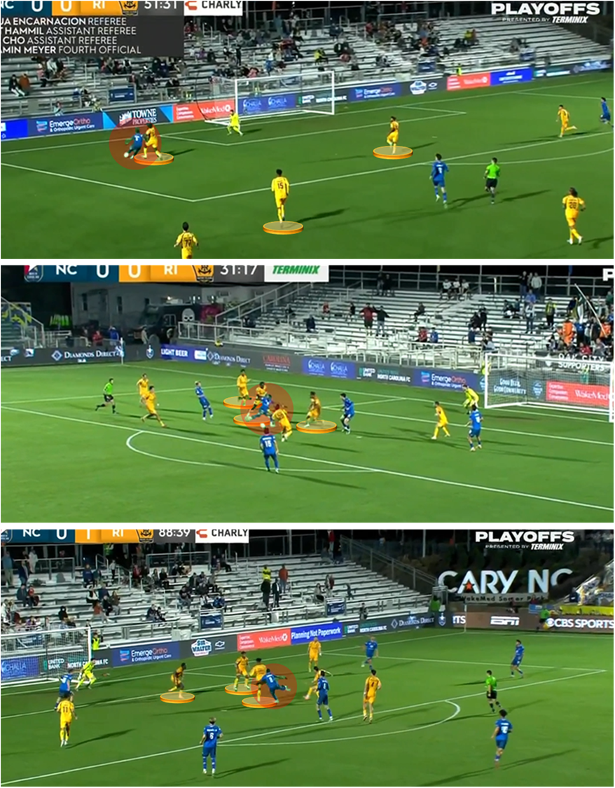 You see two examples of that line-breaking impetus here. In each case, Naples uses Kevin O’Connor and Marc Torrellas to man mark the opposing pivot. The challenge is to find balance around those players, namely by using striker Karsen Henderlong and the two wingers to clamp down on One Knox’s center backs.