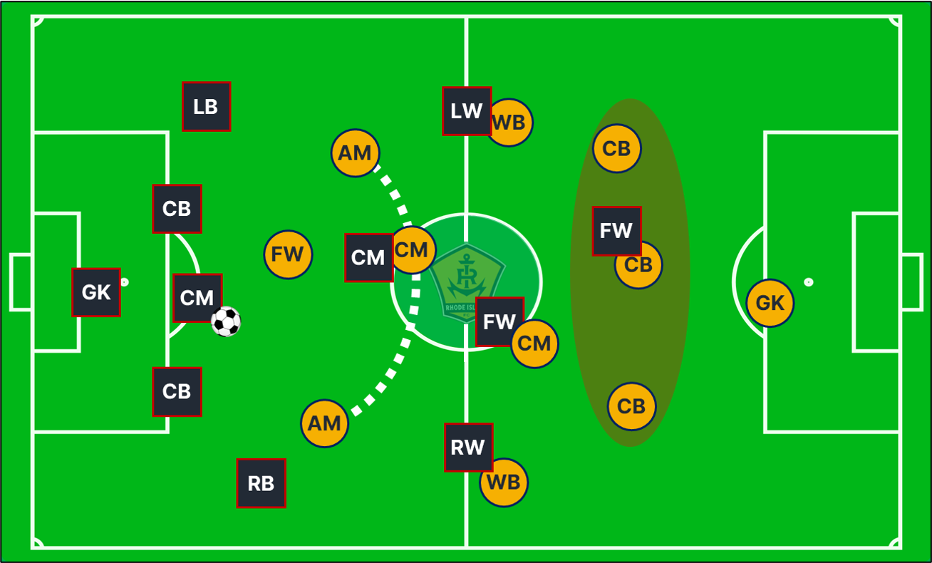 Essentially, Rhode Island are setting up in a 3-4-3 press that’s agile but steadfast through the middle. Facing down a classic double pivot alignment? You’ll often see Clay Holstad drop from an inspired right-sided deployment into a triangular midfield trio. Need to address a drop from someone like Mikey Maldonado or Aaron Molloy? RIFC has been equally able to bend into a 5-1-3-1 press with layers to stymie low-seated initiators.