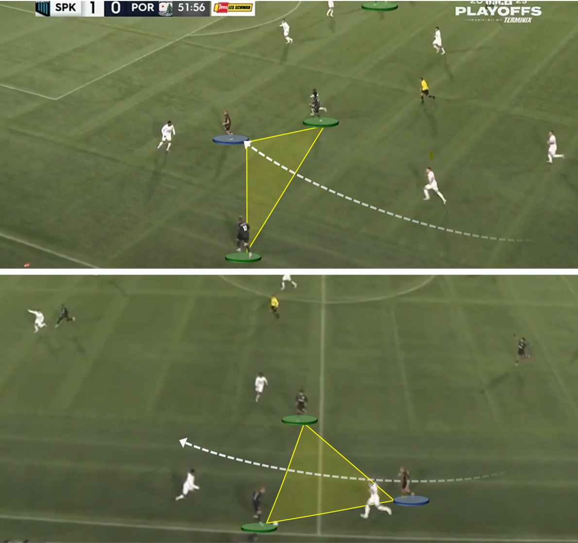 We’ve established the winning formula through the midfield, but there was a catch: using a relatively high back line to help compress the central spaces introduced vulnerabilities. In both playoff matches, forwards like Cal Jennings and Oalex Anderson found touches in genuinely dangerous positions against a backtracking defense.