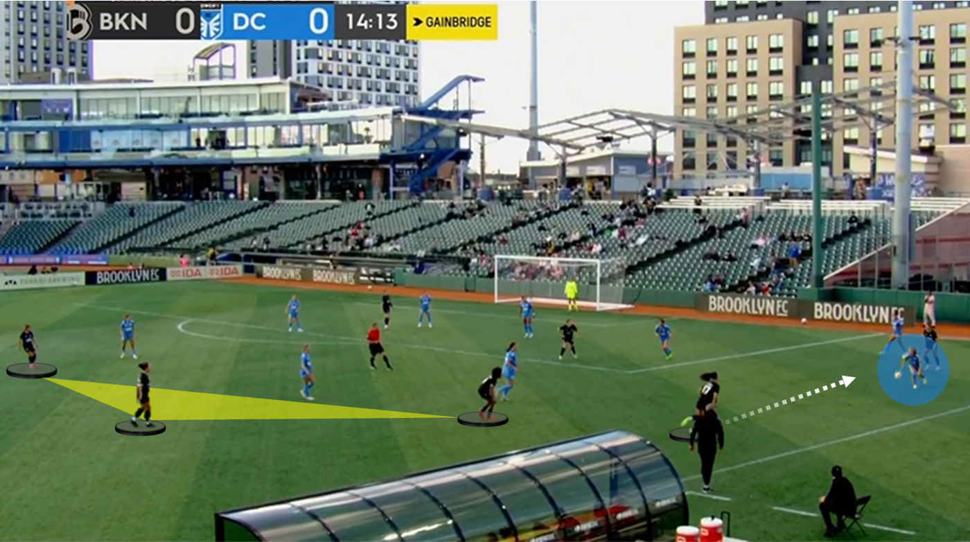 Here, you’re seeing Brooklyn fresh off of a final-third turnover after a throw-in. You’ll notice that few numbers have been committed forward, and the central foursome (in black) stands ready to halt the break. DC has a carrier outside, but she’ll swiftly be closed down by Scarpelli. On the weak side, Kroeger – one of the better No. 6s across the Super League last year, recast as a fullback over the last month – stays tight to stop any pass into Bedoya.
