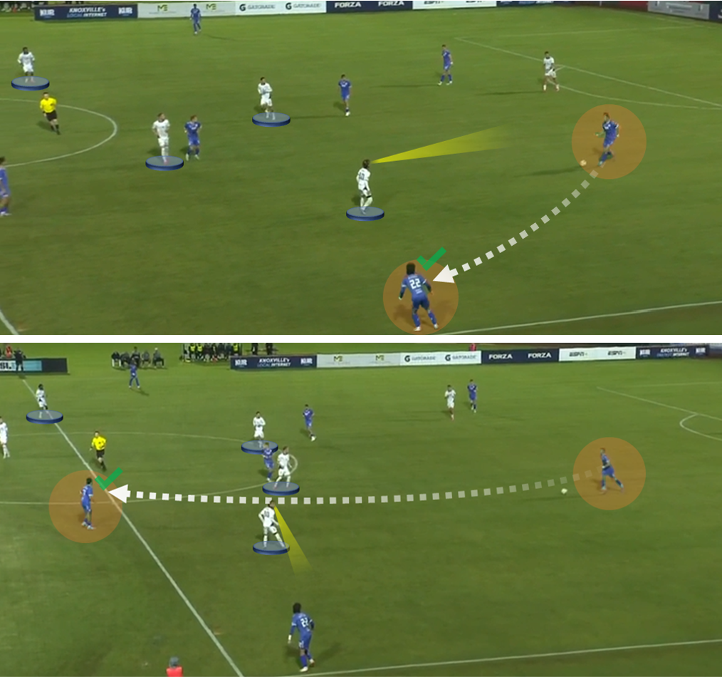 With that framework in mind, there’s an immediate problem: Henderlong is behind the ball in both screenshots. In each case, Knoxville has patiently goaded the No. 9 high and worked around him, finding Haugli in a stressful position for winger Ian Cerro.