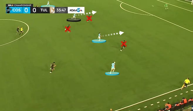 Same idea here, with the play coming on the ground. Colorado Springs lets Huerman drop in to facilitate, partnering him with right back Akeem Ward and midfielder Marco Micaletto. A Tulsa center mid closes to the latter, while a wingback addresses the former. Thus, there aren’t enough numbers to address Huerman, who can make a third-man run to receive and break lines.