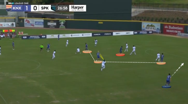 Above, Tekiela isn’t getting a touch, but note how Spokane collapses their wings against his potential threat in the right-central pocket. Tekiela attempted four dribbles (mostly in transition) and showed a stellar sense for baiting the defense with left-footed shooting from the edge of the box. Here, those actions force the Velocity to keep immediate pressure on his back; thus, an overlapping Dani Fernandez is open up the right side.