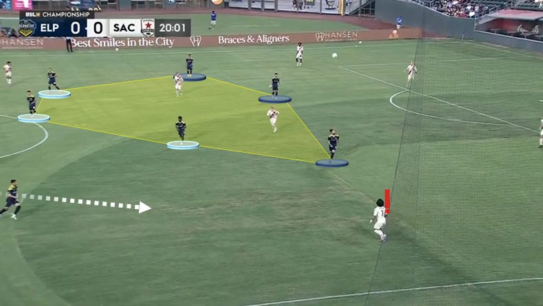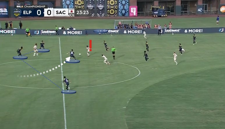 …with right back Memo Diaz seen popping upfield from right back. This screenshot firmly falls in the “4-1-2-3” bucket if we’re being strict, but you’re seeing why opponents have struggled to break El Paso down. This team rarely gives you an inch in the central areas, and they’ve aligned their defense in a manner that allows for graceful wide rotations.