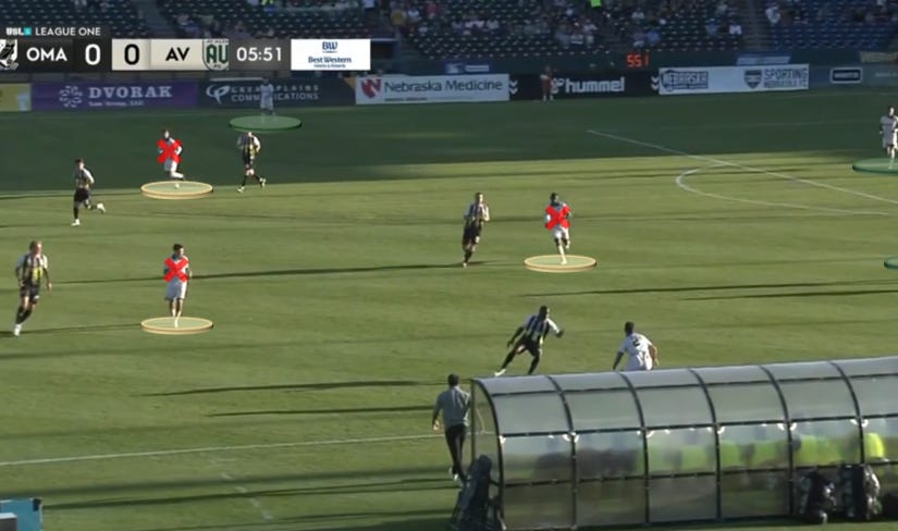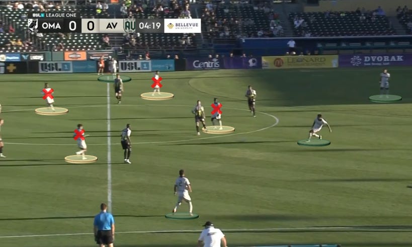 Erick Ceja, the left-sided center back and ball-carrier in this instance, has limited options. Omaha knows that they can deny the central overload by tightening their shape; their pivot is barely out of frame, but it’s staying tight to both Blancas and Robledo. As a result, Ceja will try to skip lines and go directly toward the feet of Alexis Cerritos at the No. 9 spot.
