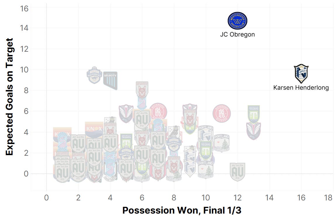 Patterns like these are a constant. Knoxville is good about minimizing the space between their lines, using their compact vertical alignment to claim the ball. They’ve won the third-most duels per game (52.6) and are highly effective at breaking forward after regaining, as we see in the transition numbers. Players like Goling and Kelly – extremely progressive vertical runners out of the midfield – and that high-hedged fullback dynamic contribute to the excellence.