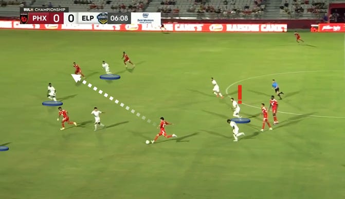 Still, every slip-up felt deadly, and El Paso compounded on those struggles thanks to recurring spatial issues. Unlike in the Sacramento match, Phoenix was regularly able to break around the edges of the high 4-3-3 and activate their wingers one-on-one against Diaz and Ruiz. Those moments drew the eyes of Ortiz and Twumasi in support, creating deleterious chain reactions.