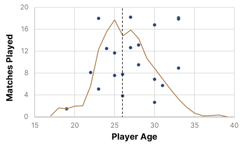 …then this chart is as good a place as any to start. What you’re seeing is an aging curve for the entire league, with Indy’s roster dotted for the sake of comparison.