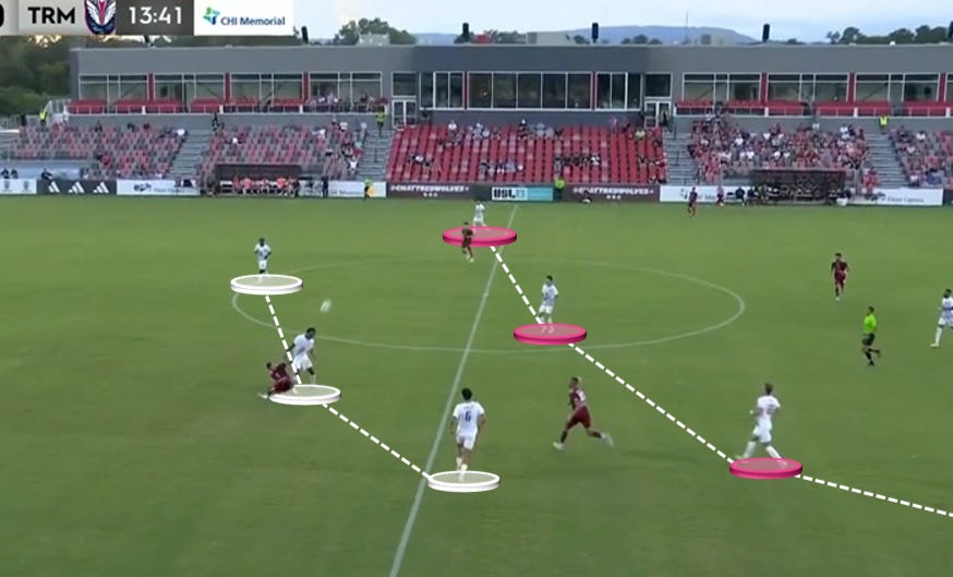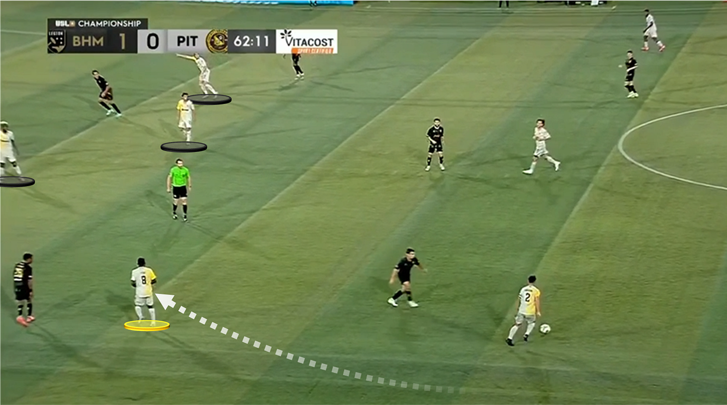 Consider this sequence, specifically noting the pace with which Pittsburgh is able to advance. Of course, you’re starting in a pressing stance here, with Etou already hedged upfield to close down on a Legion passer.