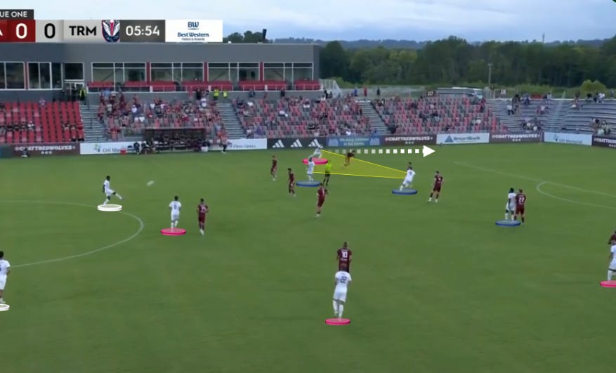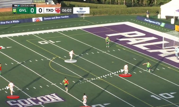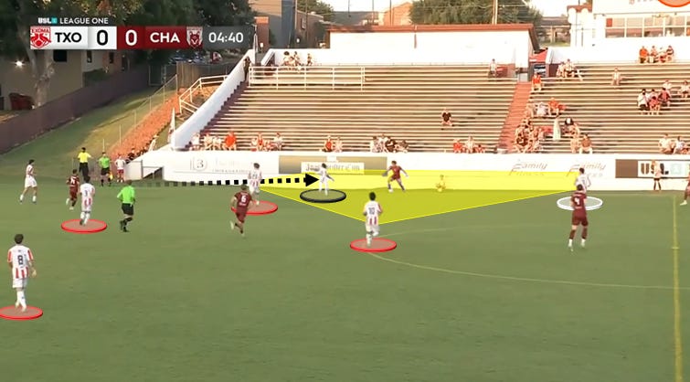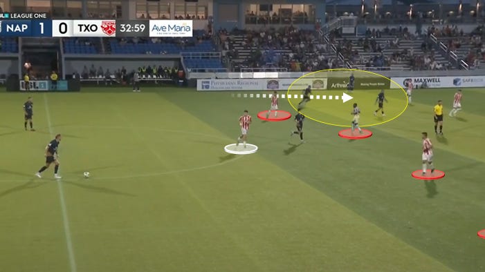 His run is highlighted, and it creates a localized three-on-two against the right side of Texoma’s back five. Because there isn’t a modicum of ball pressure, it’s easy for Naples to pick out that overload with a chipped pass toward the final third.