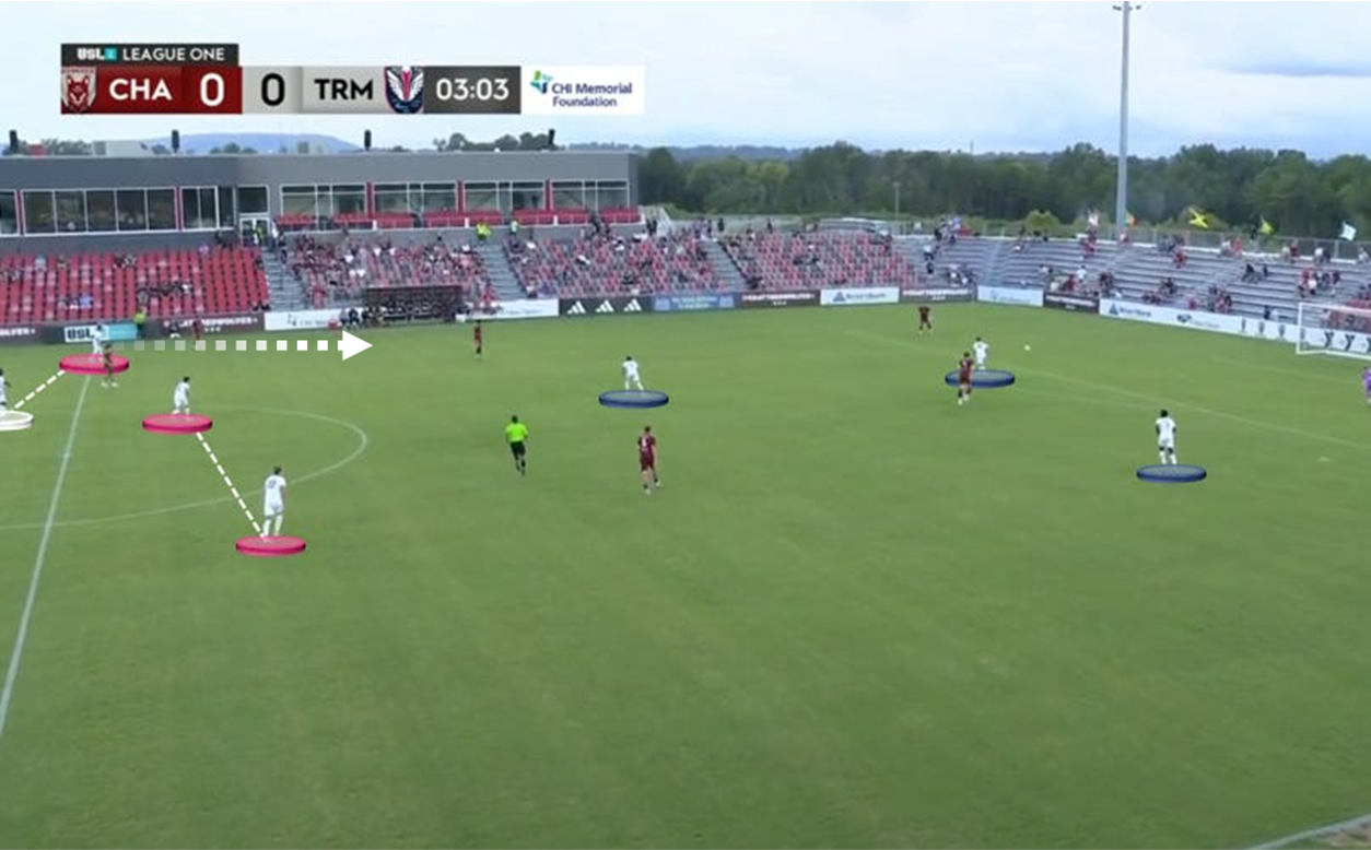 That step doesn’t come in isolation. McCormick drops from the left wing of the 5-2-3 and achieves two things by doing so. If Chattanooga tries to work up the sideline, he can drop low to essentially replace Jawneh. Secondly, he’s clogging a central passing lane that could allow the guests to switch the point.