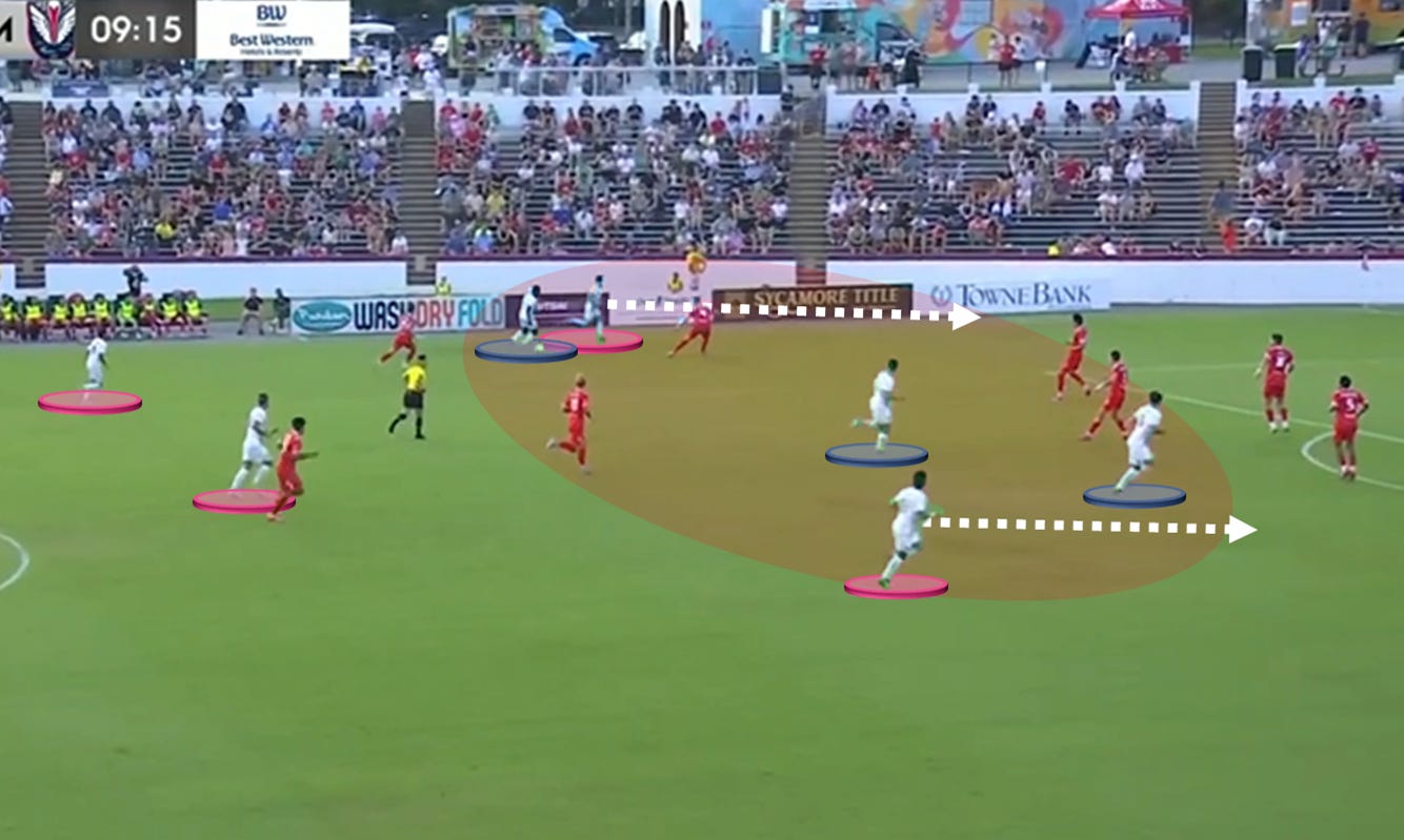 That’s what’s happening above. You can already see Gabriel Alves starting to hedge forward, getting ready to shut down a potential receiver. Alves attempted 10 duels in the game against Richmond, and he combined with right-sided Oscar Jimenez to make seven recoveries in that match to boot.