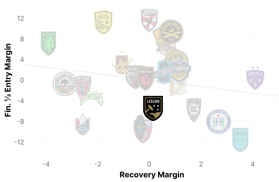 In a season-long context, that’s a familiar trend. The Legion rank sixth-from-bottom in the USL in terms of their final third entry margin, meaning that their opponents are far better at moving the ball into useful areas.