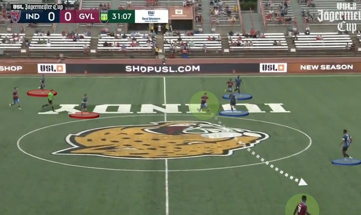 Defensive transitions are a bugaboo for every team in the league – I just burned oxygen on them in the Birmingham section for a reason. Still, defensive transitions are particularly troublesome when you’re got old legs on one side of the pitch – as seen here, with Musa coming under pressure and Quinn nowhere to be found. Greenville found it too easy to create line-breaking situations that forced Indy to recover with long, tiring sprints.