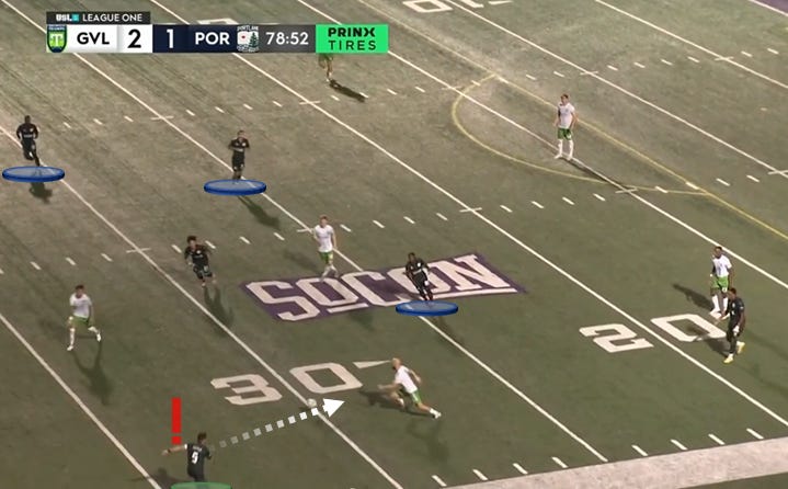 By contrast, Wednesday’s matchup against the Greenville Triumph was a different beast. Greenville pressed far harder than Charlotte, setting a firm line of confrontation not too far off from halfway. That high pressure limited the openness of the pitch, put a cap on Portland’s verticality, and made for a fascinating matchup.
