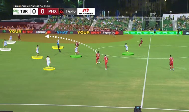 Consider the sequence here from a recent draw against Phoenix Rising. The guests possess around halfway, with 10 players behind the ball for Tampa Bay. However, that abundance of deep-seated defenders doesn’t lead to any actual ball pressure. The Rowdies sit narrow, and the way they compress their back five opens up a lane up their left sideline.