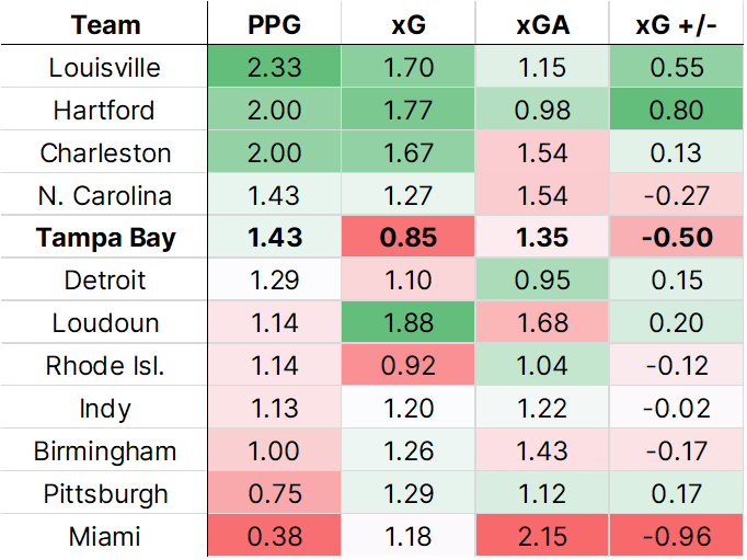 Where does that leave us? The underlying xG numbers – East-worst offensive production and middling defensive returns – paint the outline of the picture. For my money, it’s Tampa Bay’s inconsistent ability to stay in the final third that’s holding them back. When the Rowdies waste chances close to goal, it inherently allows the opposition to go to work.