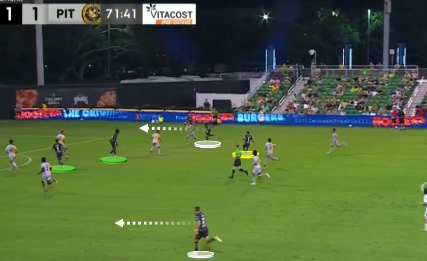 These sorts of issues were rampant over the weekend against Pittsburgh, at least for 45 minutes. There, Tampa Bay conceded in the third minute in a very similar situation to the one we’re seeing above. The difference? Pittsburgh used the light pressure to drive toward the right channel, where wingback-winger interchange went unchallenged and allowed the Riverhounds to slice into the box.