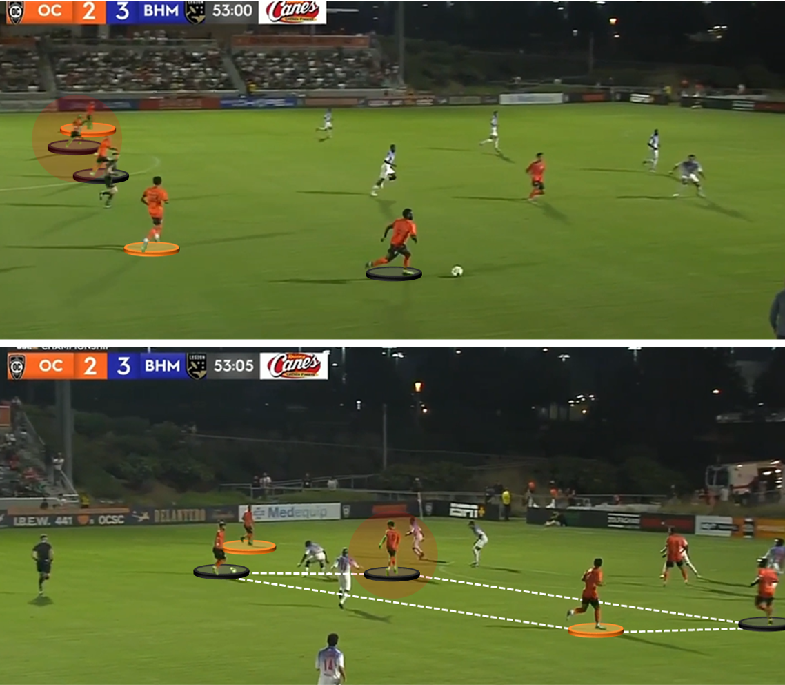 It’s a familiar pattern, but the flexibility stands out. Usually, Ciotta is the one to sit deep and essentially give Orange County three rest defenders. Here, though, he’s operating like a center mid while Nico Benalcazar does the dirty work out of frame.