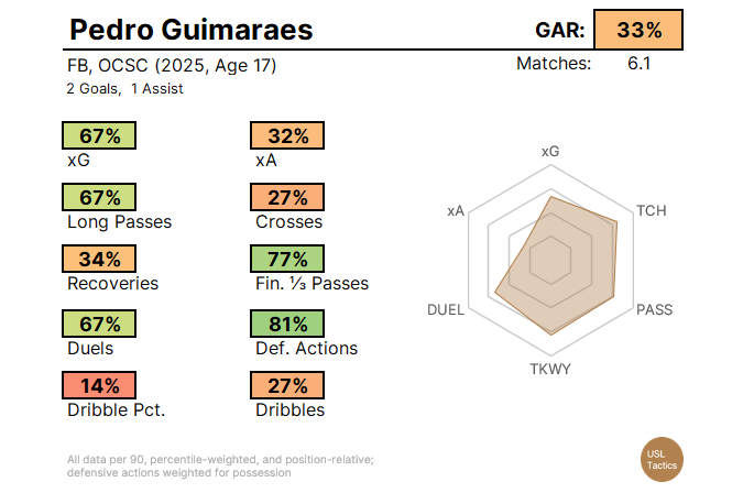 Fascinatingly, games where Guimaraes starts see Orange County hold 56.5% of possession on average. That number is merely 47.6% when he’s out of the lineup. Weird game states can muddy the statistical waters in a small sample, but it’s clear that Guimaraes has the skill and flexibility to meaningfully improve OCSC as a ball-controlling side. How he continues to blossom at Championship Soccer Stadium will be fascinating to see for the rest of 2025.