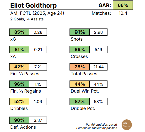 Now, Scott enters the mix as one of the premier initiators in the USL – perhaps only bested by Lexington’s Aaron Molloy. Before being sold to Crawley Town last summer, the Englishman put up 95th percentile touches (70.7) and final-third entry passes (10.1) per game. Scott is defined by his erudition; he knows when to push upfield, but he also knows when a sideways pass is necessary. His 87% touch retention rate in 2025 was among the USL's highest.