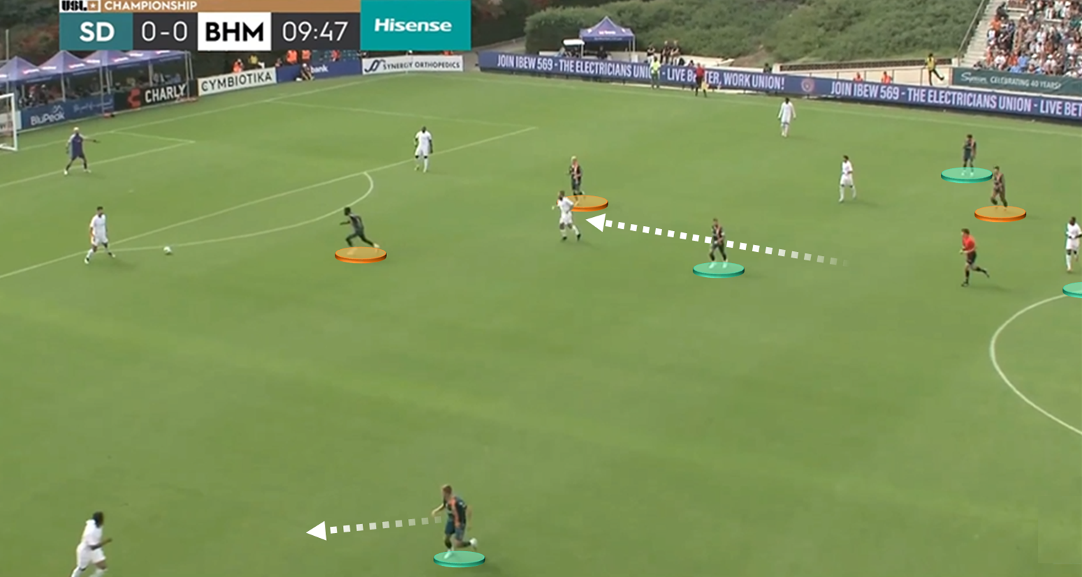 Here, you’re seeing Loyal bent into pressing mode, hinging their 3-4-3 to limit their opponent’s passing options. At the near sideline, Bodily is seen closing toward the ball-side fullback, whilst Adams has stepped high to mark an opposing No. 6. San Diego wasn’t an especially audacious pressing team in 2023 – their PPDA and defensive action height were basically at the USL median – but they picked moments to press the issue. Bodily and Adams already have those triggers down.