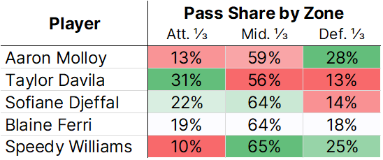 Putting "Aaron Molloy" and "needs to be used differently" together is silly. You can't argue that Molloy was misused in Charleston; the Battery put up the USL’s most xG by using him in deep-lying positions, forcing defenses to overextend before pinging into the attacking half. Still, it’s remarkable to see how much of his activity was centered in the defensive zone compared to Lexington’s No. 6s and No. 8s – much less Davila over in Louisville.