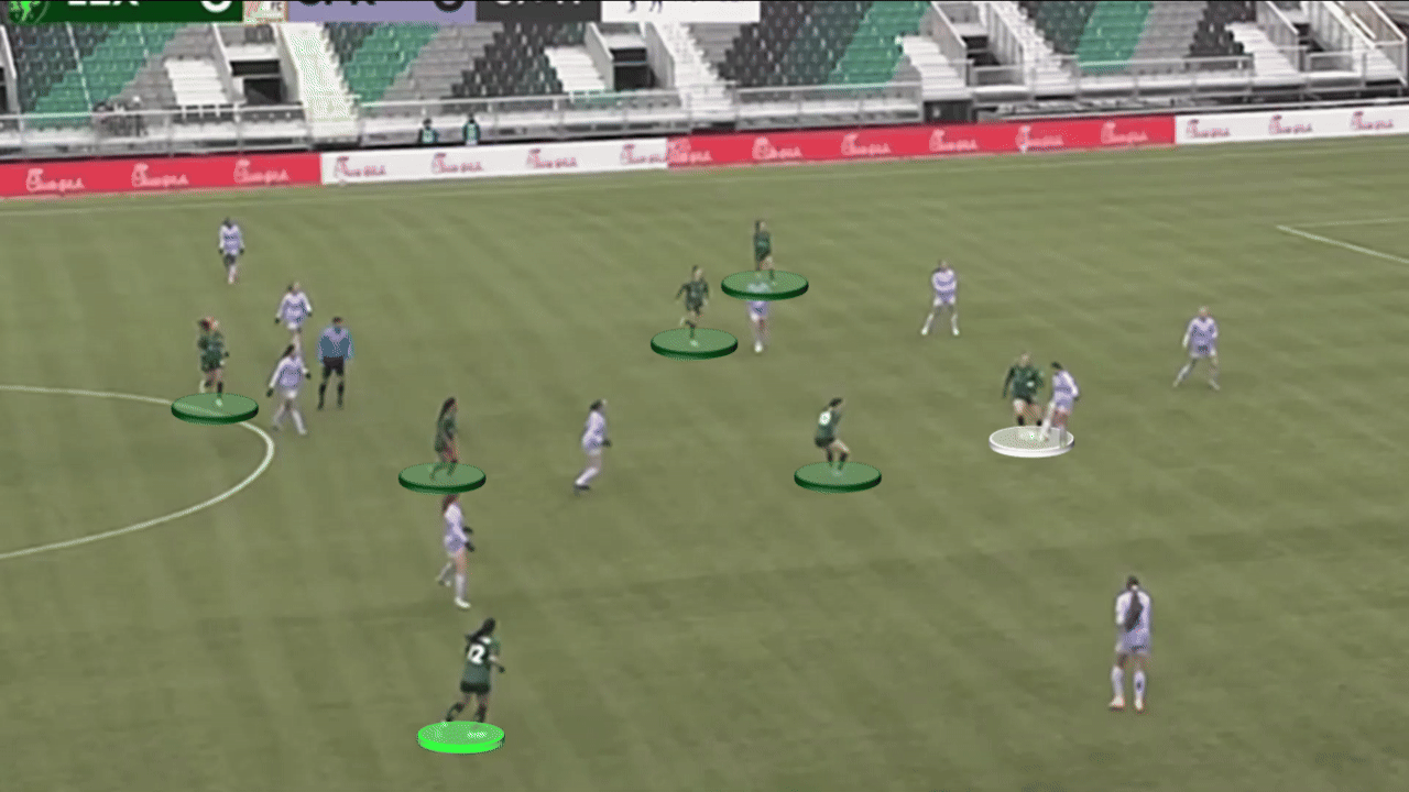 Here, I’m breaking down an exemplary play into two parts, starting with a giveaway in possession. Tampa Bay begins here with a “2-3“ base of two low center backs behind a fullback-No. 6-fullback line, hoping to draw Jacksonville’s attention upfield. When the Sun try and break lines, it happens by way of a pass into winger Sabrina McNeill’s feet through the high press.