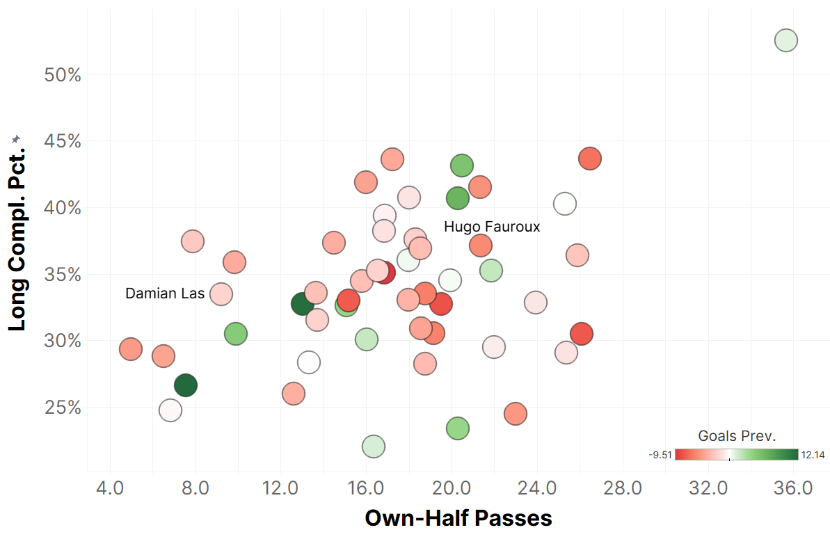 This chart is ruined by Rocco Rios Novo being insane up in that far right corner, but Fauroux still stands out for his plus-caliber passing. Meanwhile, you can see how little Las was asked to do in the run of play. Neither player actually projected well by the advanced goalkeeping numbers; Las allowed 2.0 goals above expected, while Fauroux was 5.7 underwater.