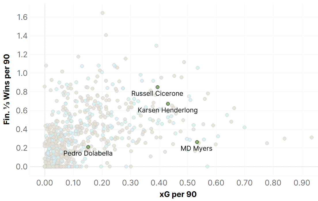 There’s a clear commonality between the attacking signings: these players, repositioned Dolabella notwithstanding, combine top-end scoring instincts with spirited participation in the press across 2025. That’s especially true of Cicerone and Henderlong, who combined for nearly 1.5 final-third recoveries per match between them last season.