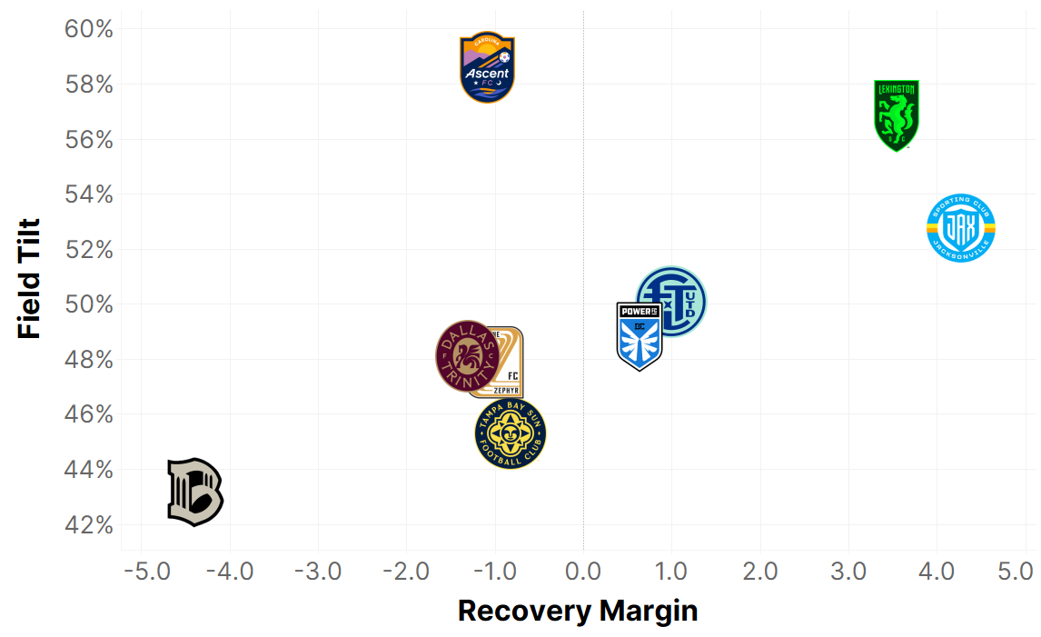 As we sit amidst the league's holiday break, what's remarkable is how tightly connected the tilt metrics are with on-field success. Four teams have a 50% field tilt or better, meaning that they attempt more final-third passes than their opponents. Those four teams – Lexington, Jacksonville, Carolina, and Fort Lauderdale – currently occupy the Super League's four playoff positions.