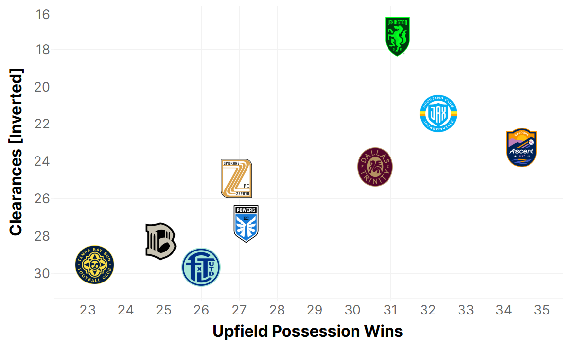 Comparing upfield possession wins (i.e., final- and middle-third recoveries) with clearances (usually made in one’s own box) provides another angle from which to view pitch control. Again, you’re seeing familiar faces – this time joined by Dallas, who’s three points back of a playoff spot with a game in hand for a reason!