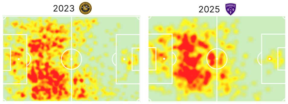 In his first two seasons coming out of Pitt, Ordonez played a healthy number of minutes on the right side of the Riverhounds’ back three. Pittsburgh wasn’t quite at “Rob Vincent title run” levels of field tilt during those two seasons, but Ordonez still made an offensive impact. The defender completed 1.44 final third passes per game while at Highmark Stadium, a number that dropped to 0.78 in Louisville.