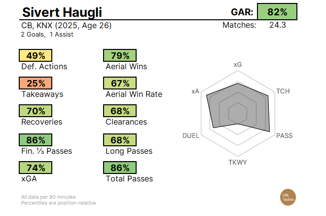 I highlighted Haugli’s passing during the postseason – he’s a terrific right-footed distributor from the left side of a center back duo – but that’s just one part of his totally complete profile. Haugli was rarely asked to step up like an intervenor in the One Knox system, but you’d struggle to find a better stay-at-home option in terms of clearances or dueling.