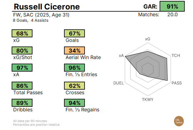 Martinez’s movement was consistently strong, and he posted 92nd percentile final-third passing numbers with Alta. He was also a 70th percentile dribbler on a roughly median success rate, using that tool to break defenses down in a system that discouraged turnover-creating crosses. For my money, Martinez would be even sharper in a more open system, and someone in the USL is likely to find that out in 2026.