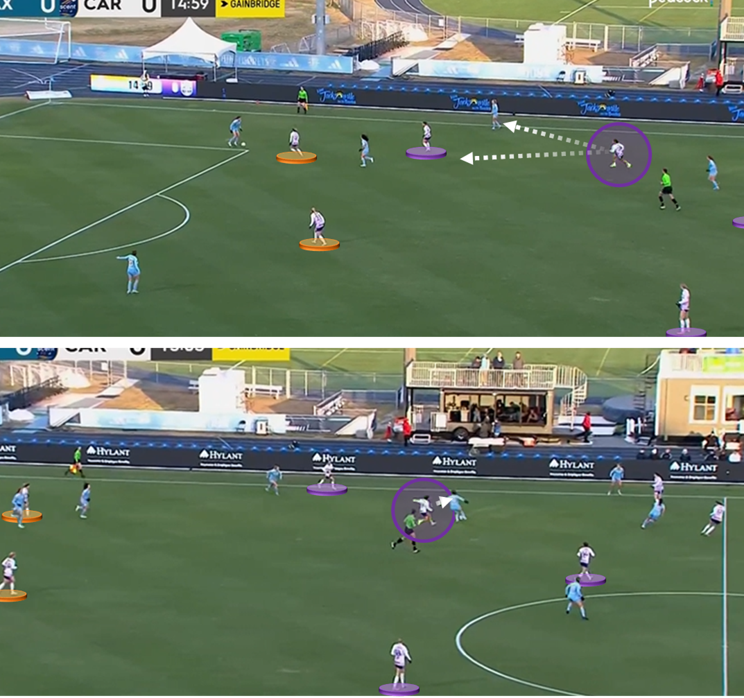 In the clip, McCamey's pass falls incomplete, but another new presence – Stainbrook – is there to make up the difference. She collapses to the ball, contests multiple duels, and then starts to backtrack to help restore Dallas' 4-2-1-3 structure. In sum, McCamey went 7/8 on ground duels and led all outfield players with 13 recoveries.