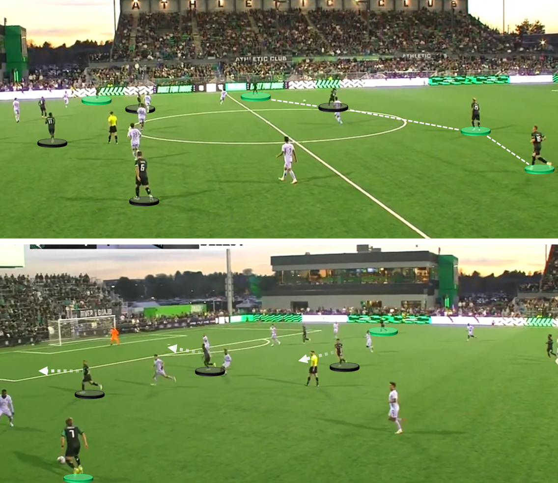 Here. you see a typical Boise possession broken down into two key frames. More often than not, midfielder Phillip Mayaka dropped to the level of the back three. He ended up with 93 touches and 83 pass attempts, only seven of which went long.