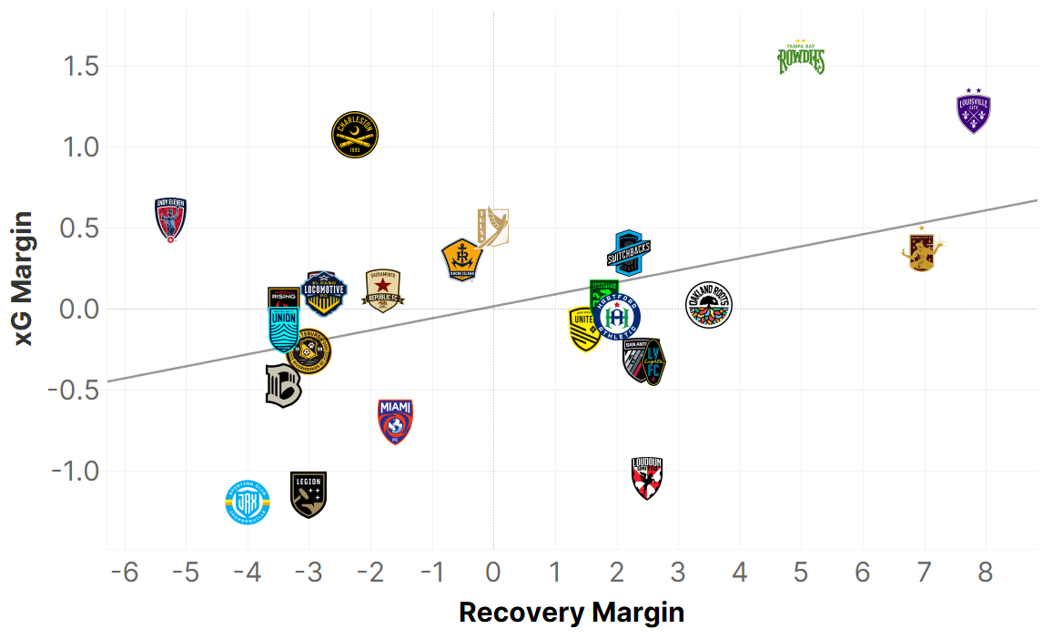 Even so, there are exceptions. Charleston has been below water in recovery situations but lit up the xG numbers; Indy is in a similar neighborhood, though the extremity of their long-ball style creates quirks. On the opposite side, clubs like Oakland and San Antonio have been able to regain on the regular without generating great xG numbers.